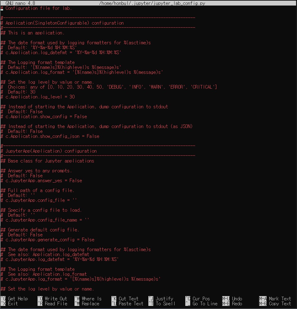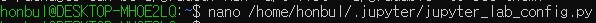 nano /경로/jupyter_lab_config.py 입력 <-- 위 사진처럼 1번 명령어를 입력하면 저장되는 경로가 프린트 된다.