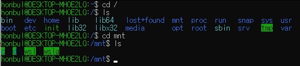 리눅스의 경우, mnt 폴더에 C 드라이브와 D 드라이브가 연결되어 있다.
