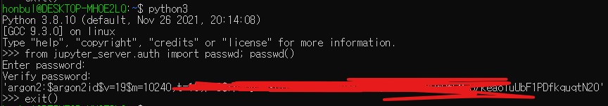 파이썬 창에서 from jupyter_server.auth import passwd; passwd() 입력