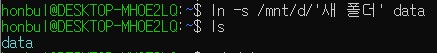 필자의 경우 /home/honbul/ 에 위치한 상태에서 /mnt/d/'새 폴더' 의 데이터를 data라는 바로가기 폴더로 연결하였다.