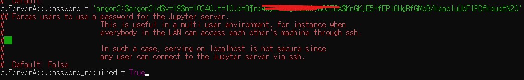 그리고 밑의 c.ServerApp.password_required 부분 또한 주석 해제 후 (# 지움) True를 입력해 준다.
