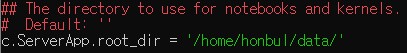 c.ServerApp.root_dir 부분을 찾아, 주석을 해제하고 (# 지움) 아래 그림과 같이 바로가기 폴더 경로를 입력해 준다.