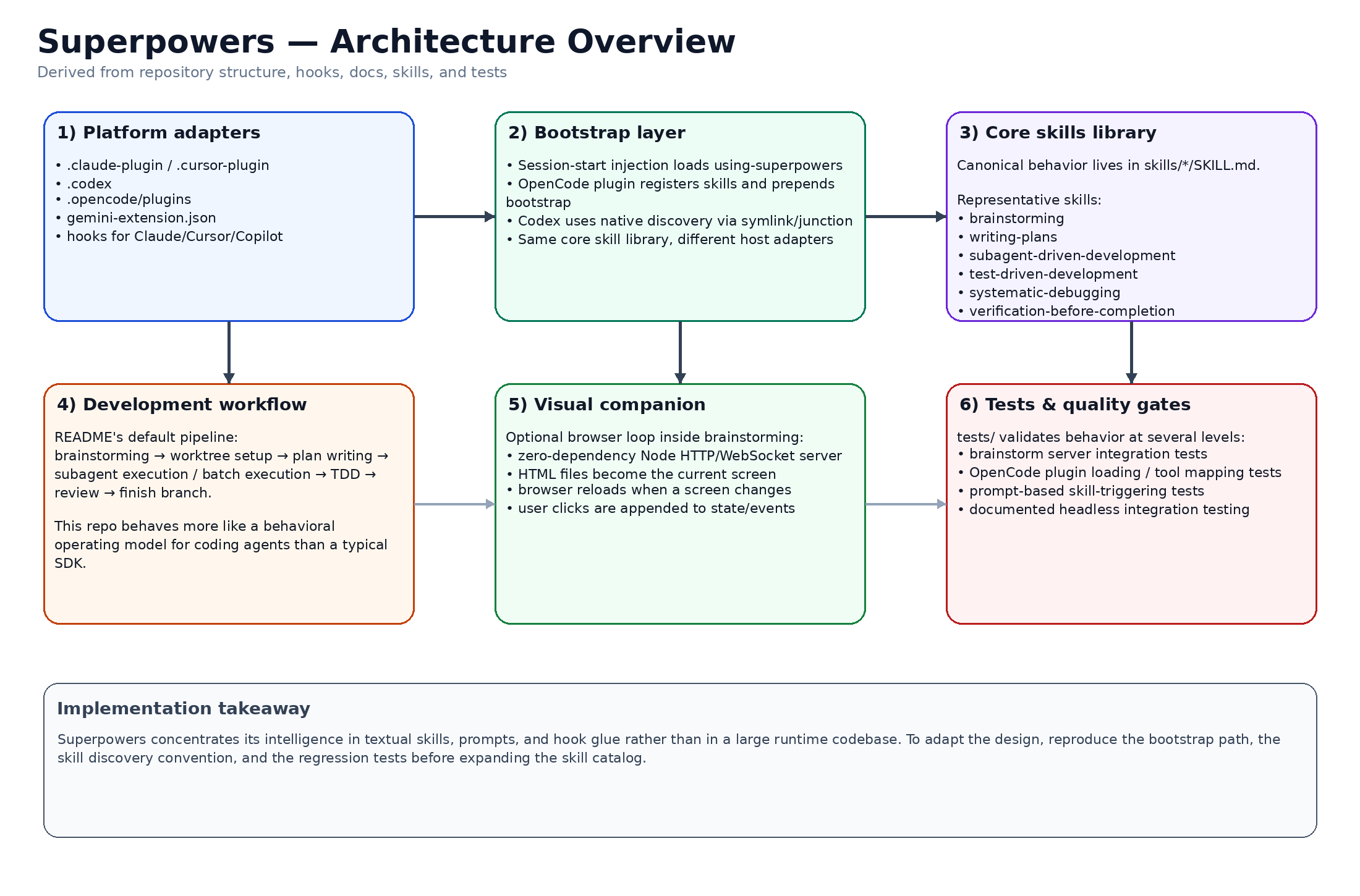 Superpowers는 “코딩 에이전트용 프롬프트 모음”으로 보기엔 과소평가고, “범용 에이전트 오케스트레이터”로 보기엔 지나치게 가볍다.