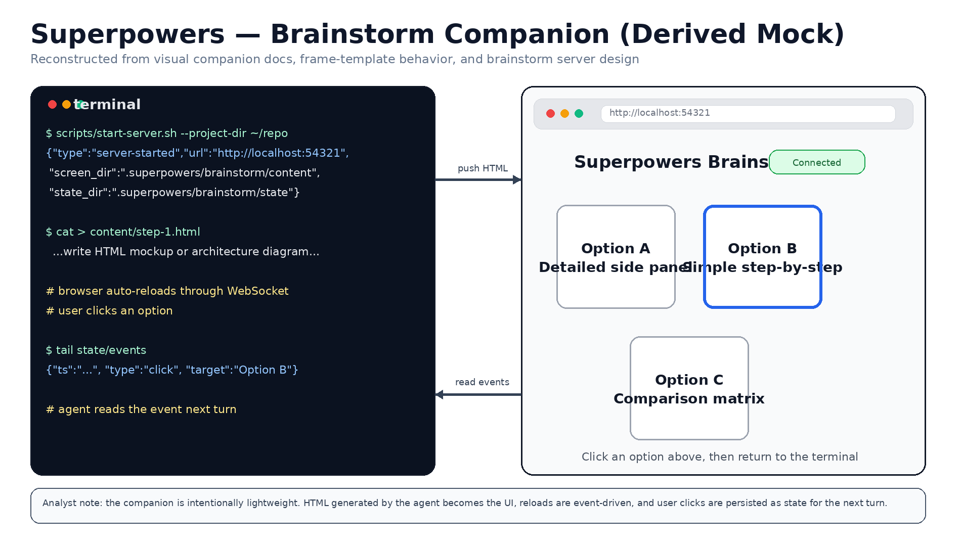 brainstorming skill은 단순 대화형 질의응답이 아니라, 필요 시 HTML 화면을 띄우고 사용자 클릭을 다음 턴의 입력으로 되먹임하는 가벼운 브라우저 companion 패턴을 갖는다.