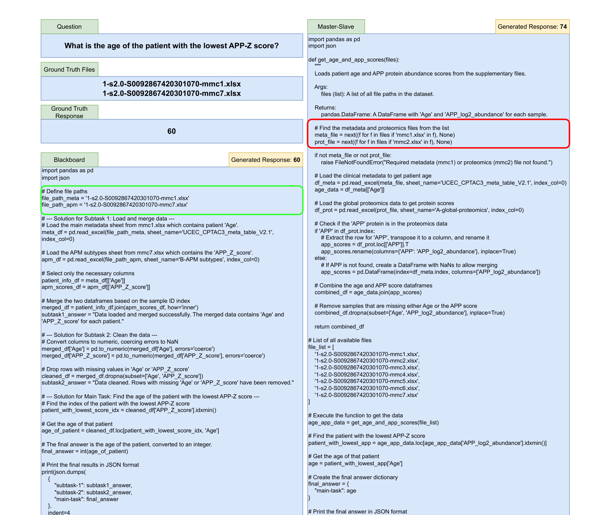 Figure 15. 동일한 질문에서 Blackboard는 올바른 파일(mmc1.xlsx, mmc7.xlsx)을 선택해 정답 60을 만들고, Master-Slave는 잘못된 파일(mmc2.xlsx)을 골라 오답 74를 낸다.