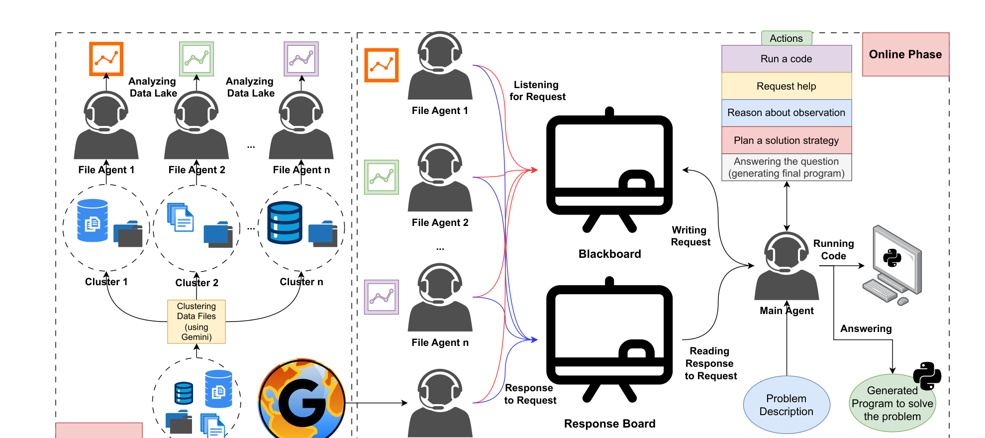 Figure 1. 데이터 레이크를 여러 클러스터로 나누고, 각 클러스터를 file agent가 맡는다. 메인 에이전트는 blackboard에 요청을 게시하고, 각 에이전트는 자율적으로 응답한다.