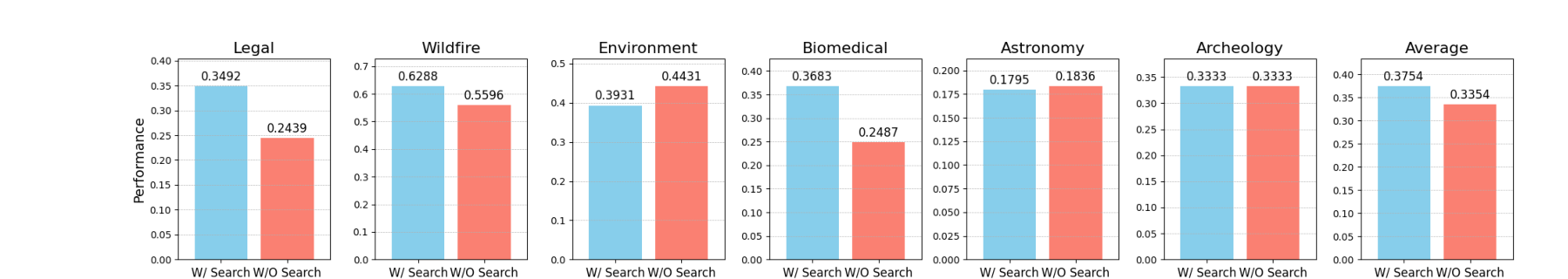 Figure 18. Search agent를 넣었을 때와 뺐을 때의 성능 비교. 평균적으로 search agent가 있을 때 더 높은 성능을 보인다.