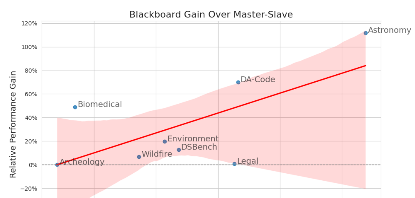 - y축: Master-Slave 대비 Blackboard의 상대 성능 이득
