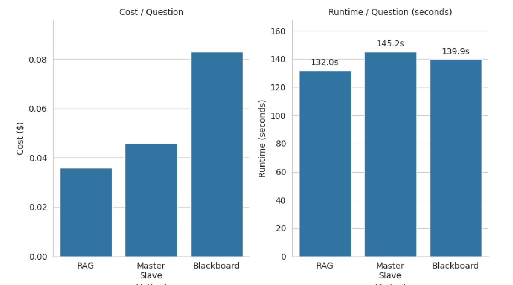 Figure 21. Blackboard는 RAG와 Master-Slave보다 비용은 더 들지만, 런타임은 크게 늘지 않는다.