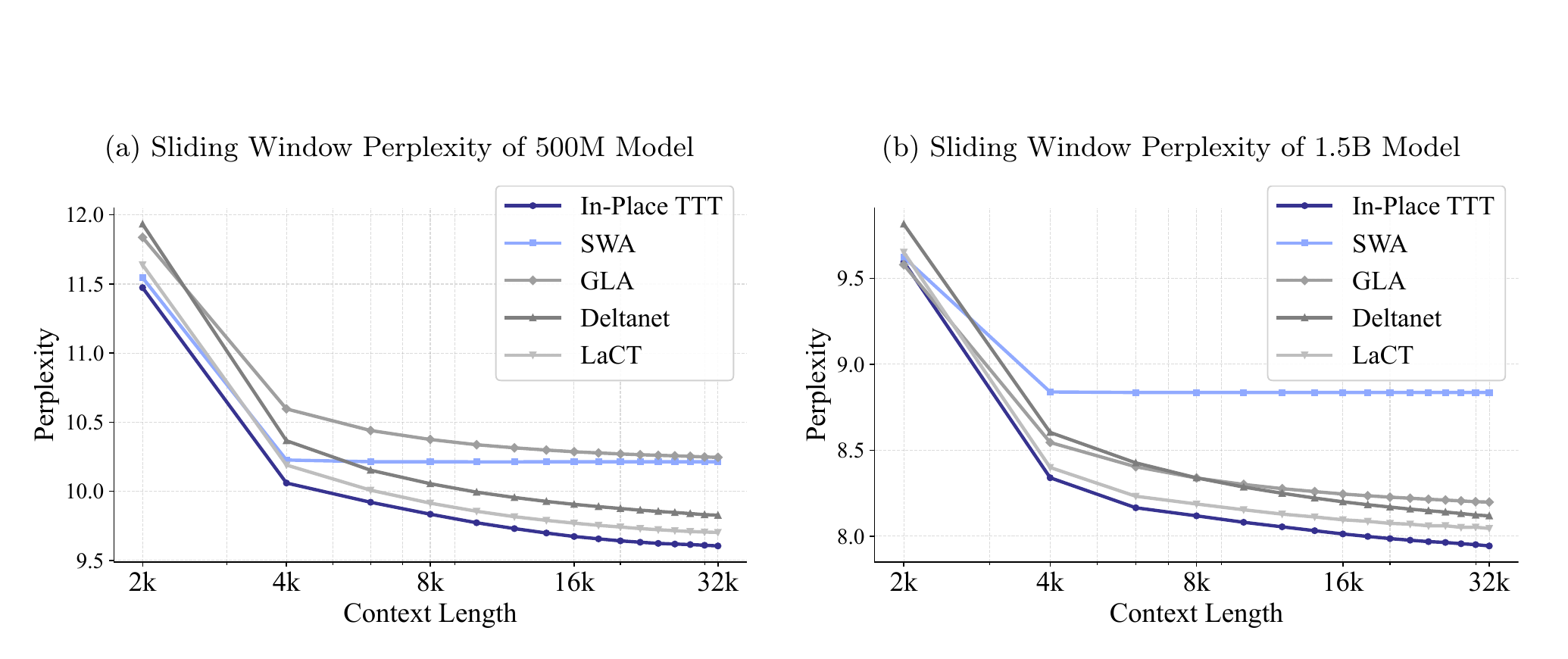 Crop 포인트: 문맥이 길어질수록 가장 아래로 내려가는 선이 In-Place TTT입니다. 긴 문맥을 실제로 더 잘 활용할수록 perplexity가 계속 내려갑니다.