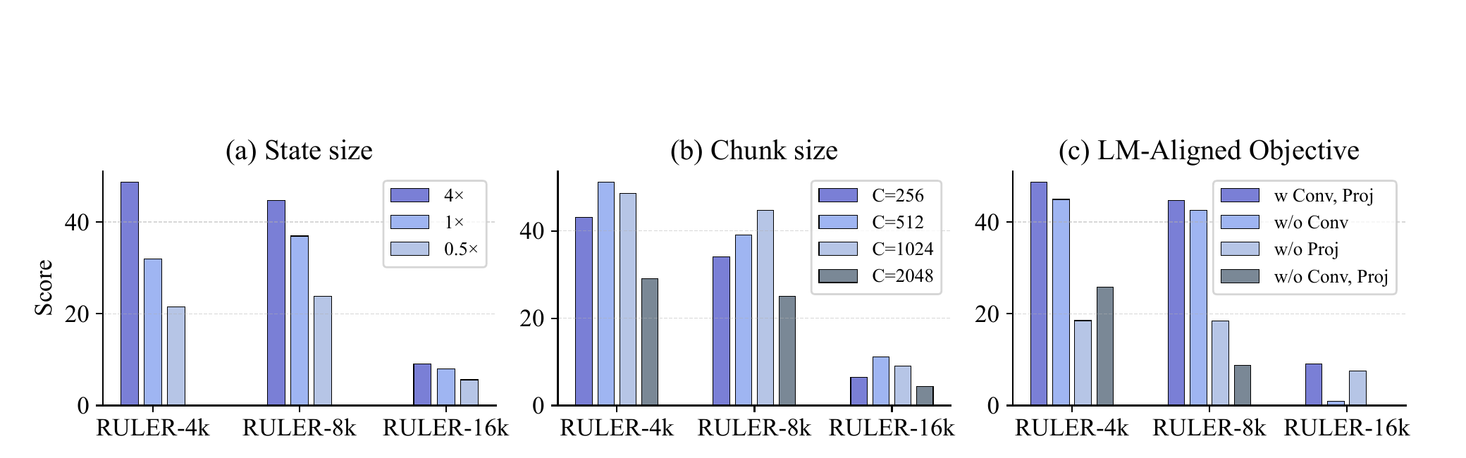 Crop 포인트: 가운데 패널에서 chunk 512~1024가 가장 균형이 좋고, 오른쪽 패널에서 Conv1D와 Projection을 함께 쓸 때 성능이 가장 안정적으로 높습니다.
