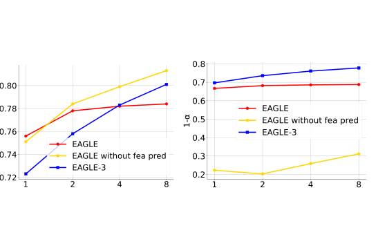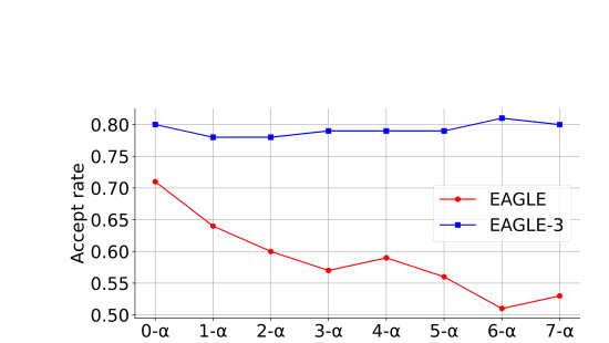 EAGLE은 자기 예측이 누적될수록 acceptance가 빠르게 떨어진다.