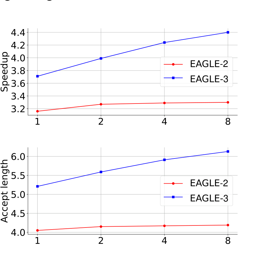 주목 포인트: 파란 선의 상승 곡선입니다. EAGLE-3는 데이터가 늘수록 속도와 한 번에 통과되는 토큰 수가 함께 올라갑니다.