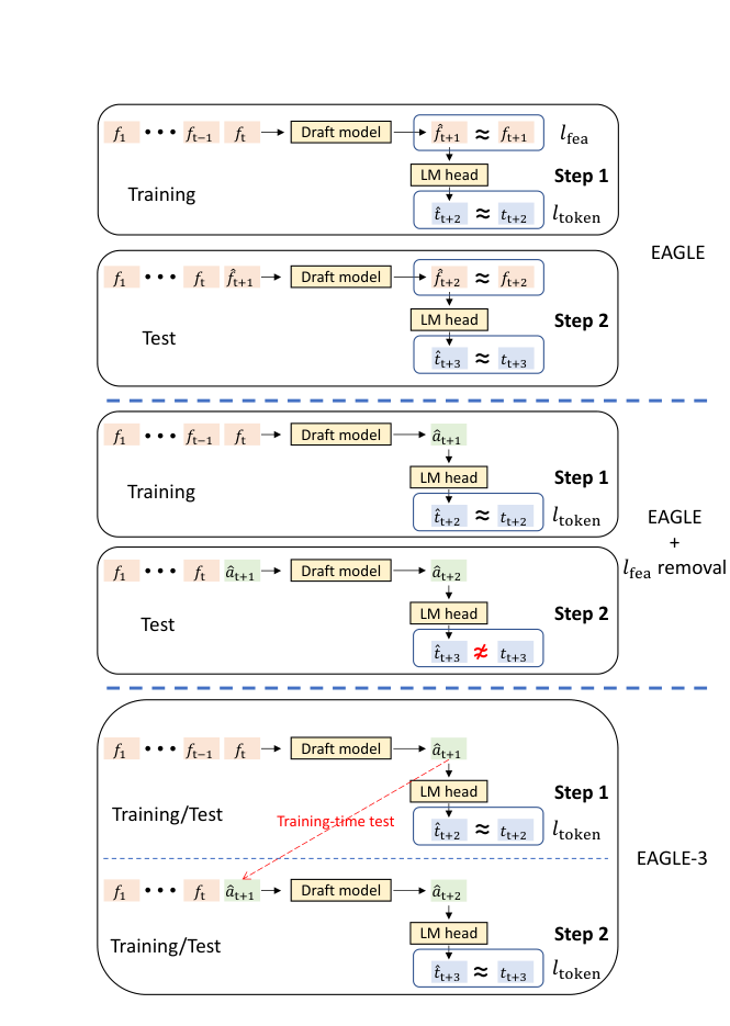 주목 포인트: 맨 아래 블록입니다. EAGLE-3는 훈련 단계부터 자기 출력을 다시 넣어 보며, 실제 추론과 비슷한 입력 환경을 미리 겪습니다.