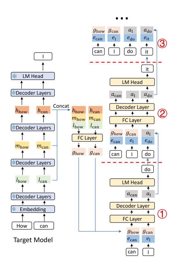 target model의 마지막 층 바로 전 표현을 재활용해, draft model이 더 많은 힌트를 받은 상태에서 초안을 만들게 했다.