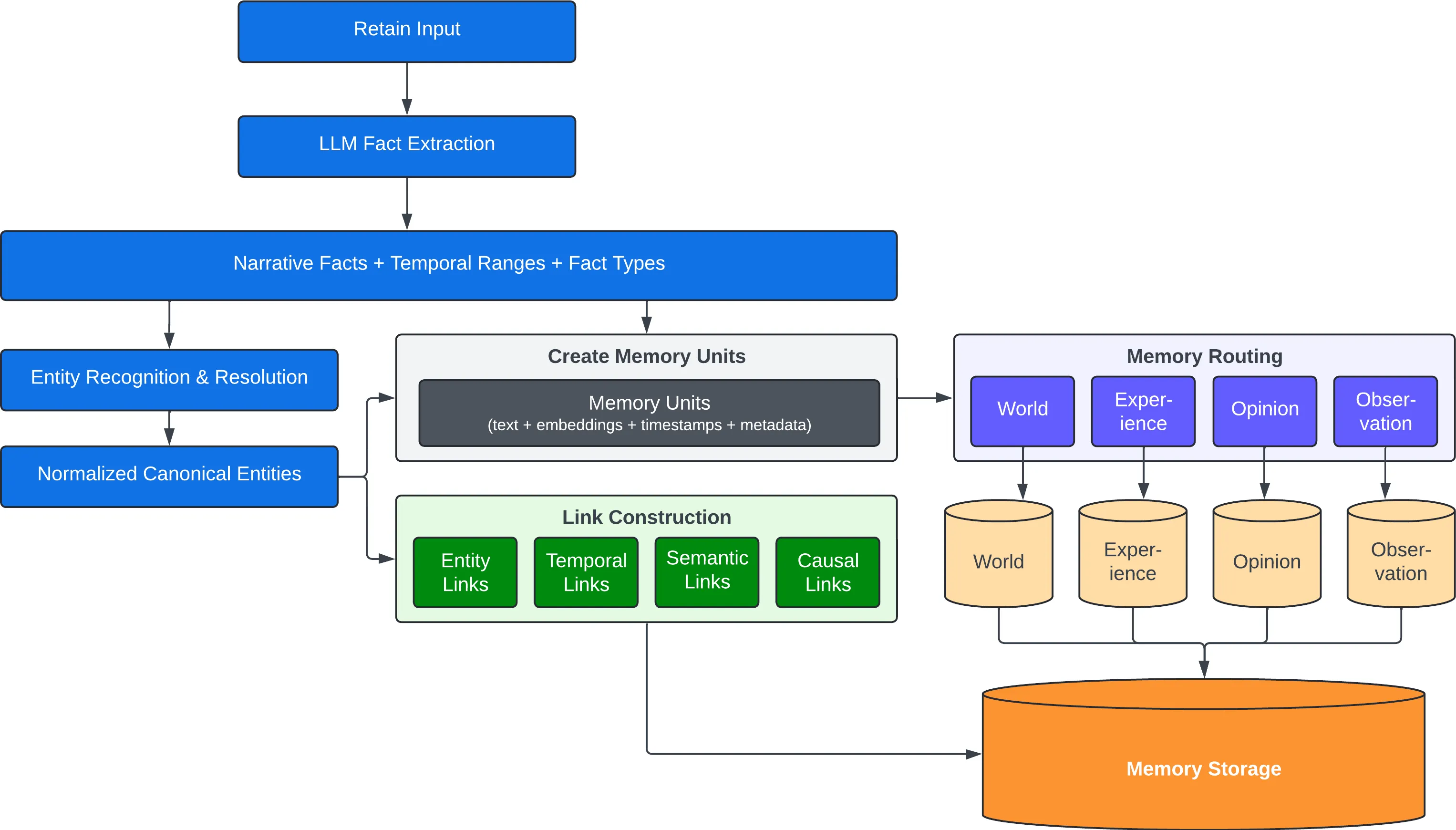 캡션: Retain은 ingestion이 아니라 정규화 파이프라인이다. 이 구조 덕분에 Hindsight는 이후 recall/reflect에서 시간, 개체, 인과 링크를 활용할 수 있다.