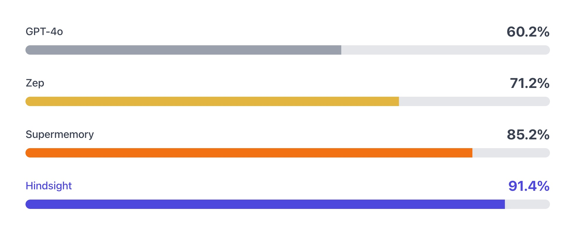 README와 논문은 Hindsight를 단순 기능 중심이 아니라 벤치마크 우위로 포지셔닝한다. 공개 자료에서 가장 자주 반복되는 수치는 LongMemEval 91.4와 LoCoMo 최대 89.61이며, full-context baseline 및 기존 memory architecture 대비 우위를 강조한다.