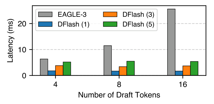 Crop 포인트: 오른쪽으로 갈수록 회색 막대는 급격히 커지지만 DFlash 막대는 완만합니다. 초안 토큰 수가 늘어날 때 병목이 어디서 생기는지, 그리고 DFlash가 왜 더 유리한지 보여줍니다.