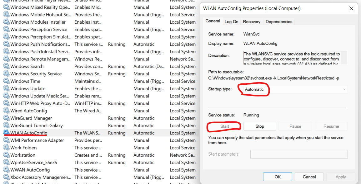 Startup type을Automatic으로 설정,