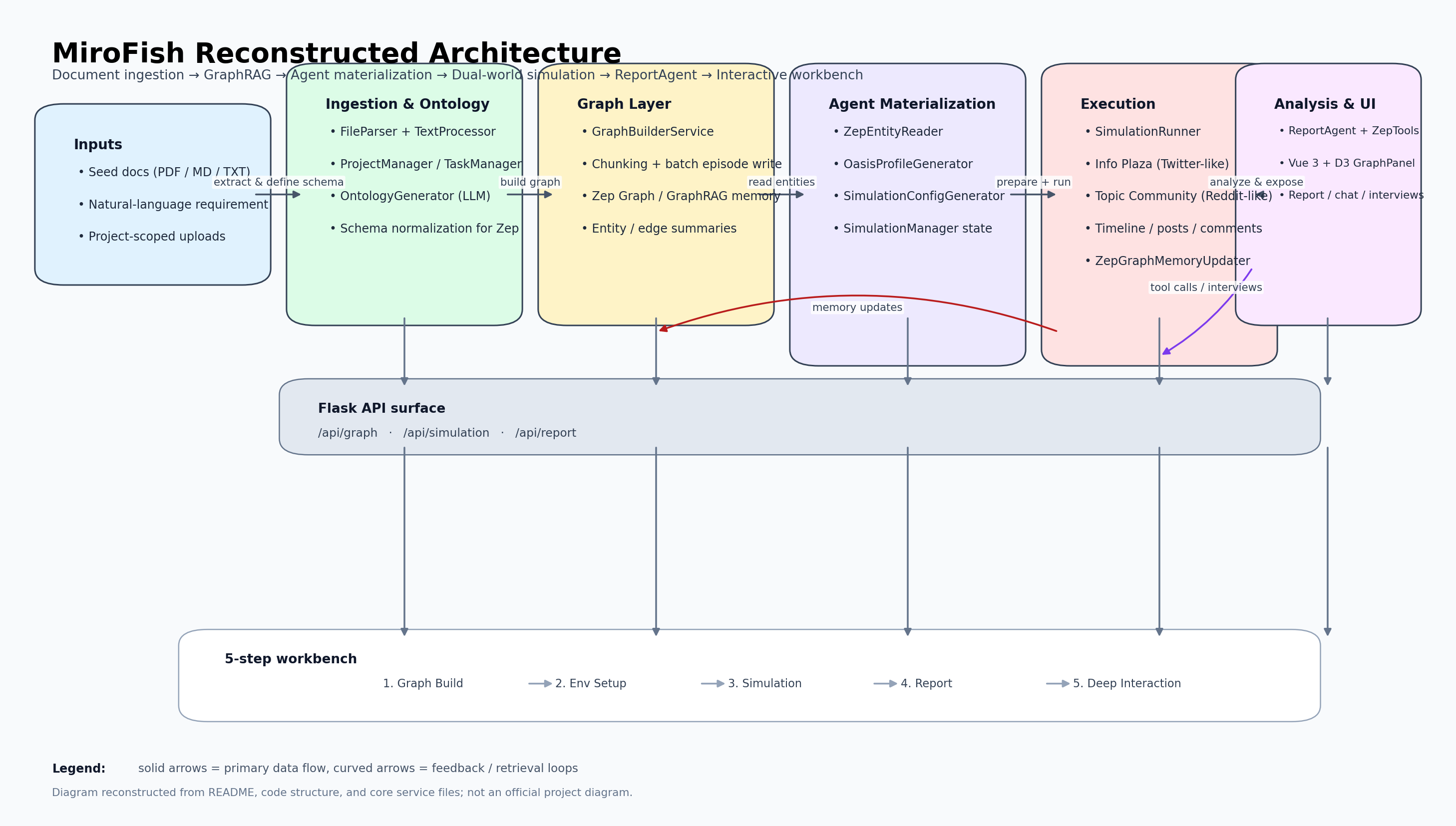 Figure 8. README, 디렉터리 구조, 핵심 서비스 파일을 바탕으로 재구성한 MiroFish 아키텍처. 저장소에 공식 아키텍처 그림이 없어 분석용으로 다시 그렸다.