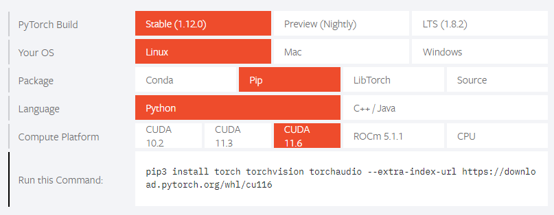 필자는 stable 버전/리눅스용/pip 패키지/파이썬/CUDA 11.6 버전에 해당하는 pytorch를 설치하였다.