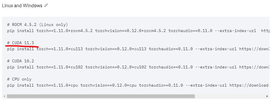 pip install torch==1.11.0+cu113 torchvision==0.12.0+cu113 torchaudio==0.11.0 --extra-index-url https://download.pytorch.org/whl/cu113 입력