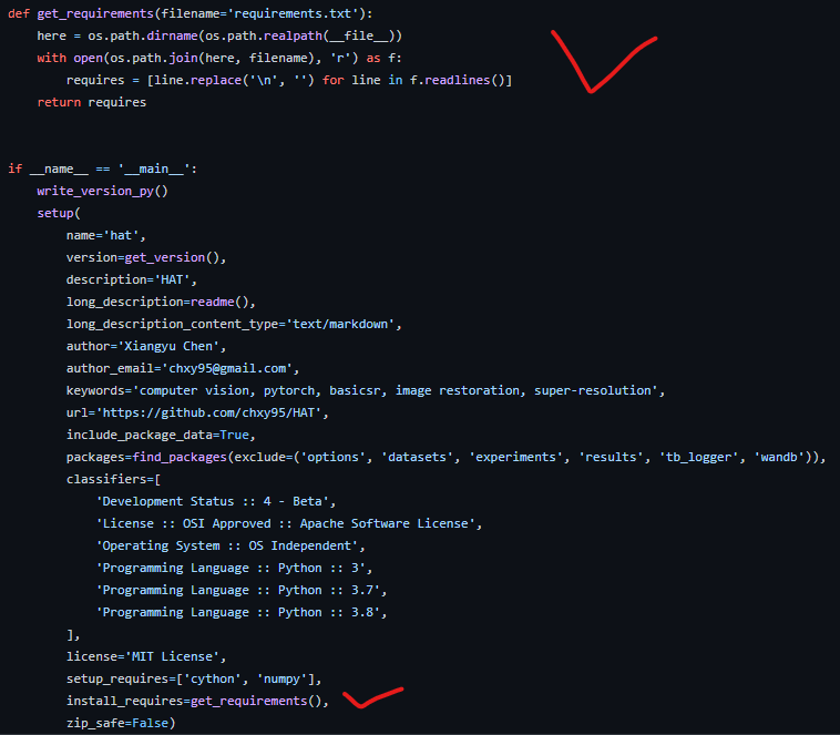 setup.py 코드 중 패키지 확인 및 설치 부분을 주석처리 한다
