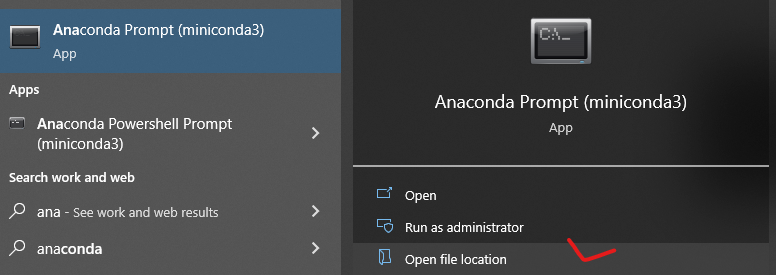 1. 윈도우 검색창에 anaconda 검색 및 파일 위치 열기