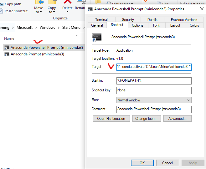 3. 1번에서 열린 anaconda 파일 위치에서 powershell prompt 속성 확인 및 Target 확인