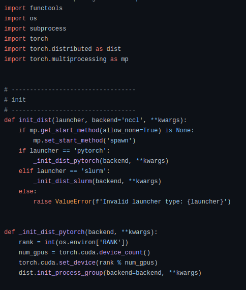 따라서 아래 사진의 가장 아랫줄의 dist.init_process_group(backend=backend, **kwargs) 부분을 수정
